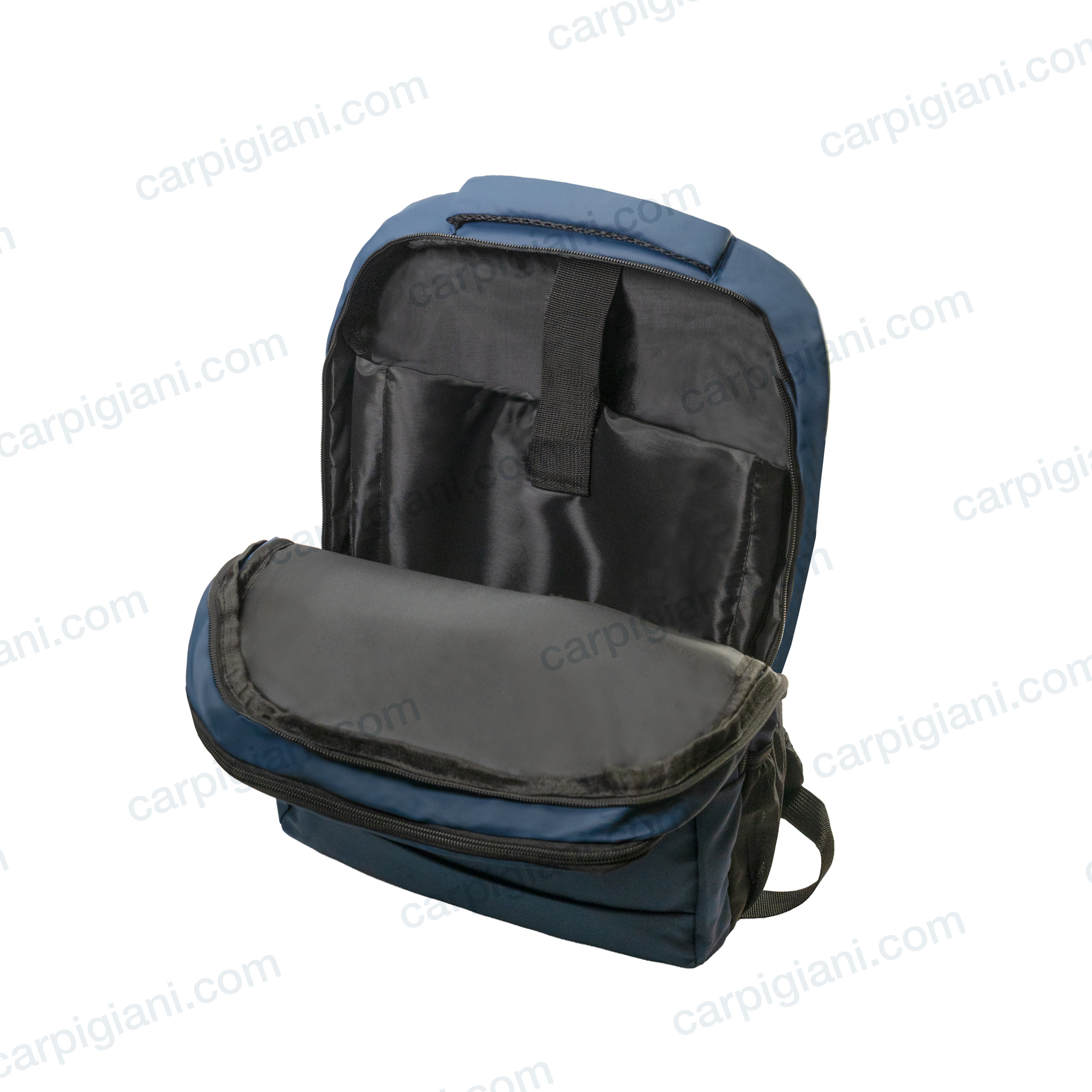 Laptop backpack with embroidered Carpigiani logo. Features a padded laptop compartment, a zippered front pocket, and mesh side pockets. The back panel and shoulder straps are padded with breathable material, and the backpack includes a trolley attachment system.